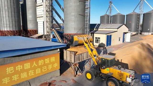 10月14日,在北大荒集团黑龙江共青农场有限公司粮贸中心,铲车在进行粮食清选工作(无人机照片)。