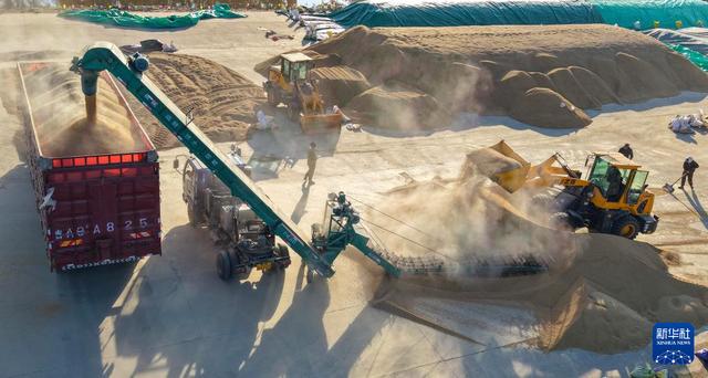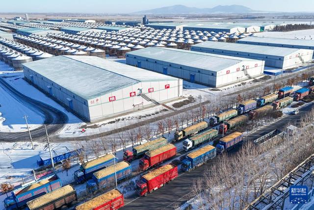 12月12日,送粮车在黑龙江省富锦市一粮食收储企业门前排队(无人机照片)。