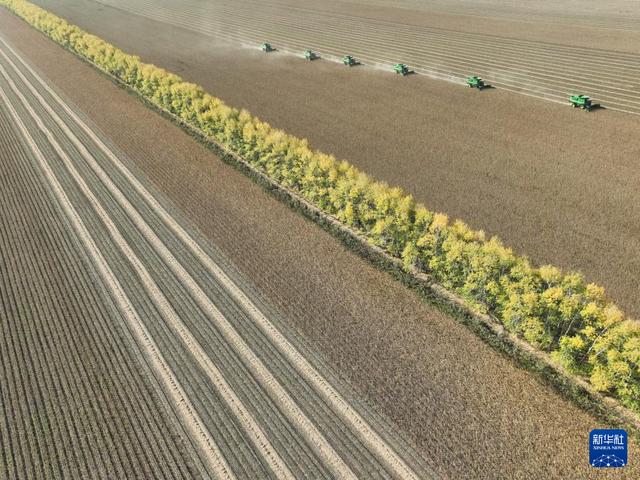 9月30日,在北大荒集团黑龙江大西江农场有限公司第五管理区,大型收割机在大豆种植地块进行收获作业(无人机照片)。