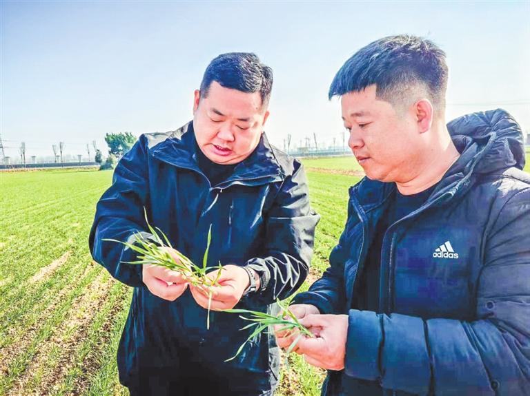 张银垒(左)查看硒麦长势 姬冠鹏 摄