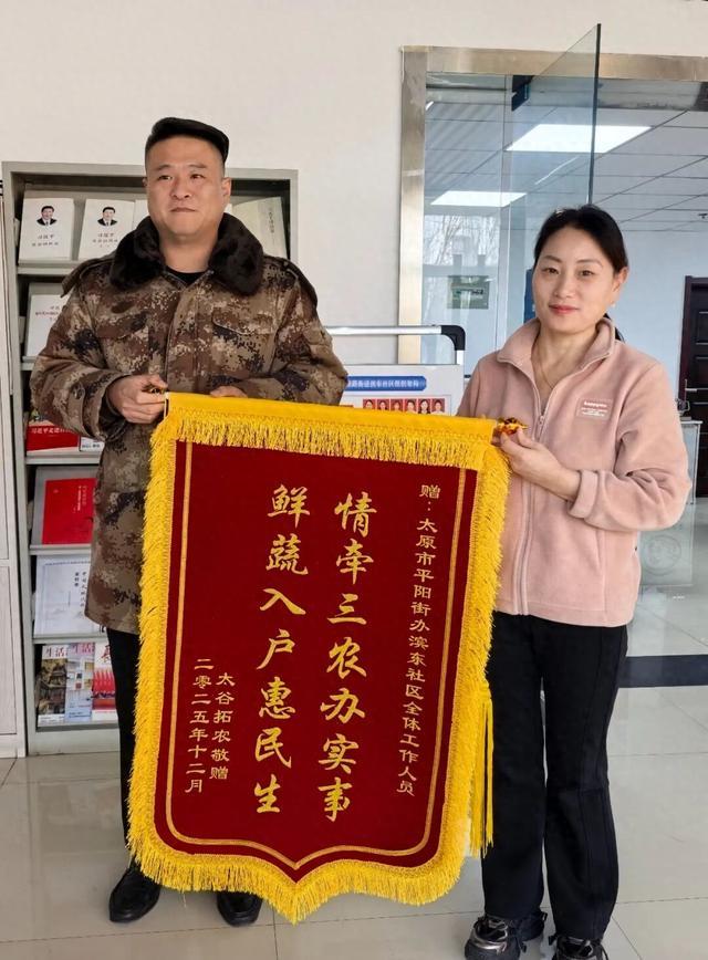 12月9日,滨东社区新时代文明实践站收到一面印着“情牵三农办实事 鲜蔬入户惠民生”的锦旗。这是太谷拓农蔬菜批发配送中心对社区“惠民助农”活动的致谢。