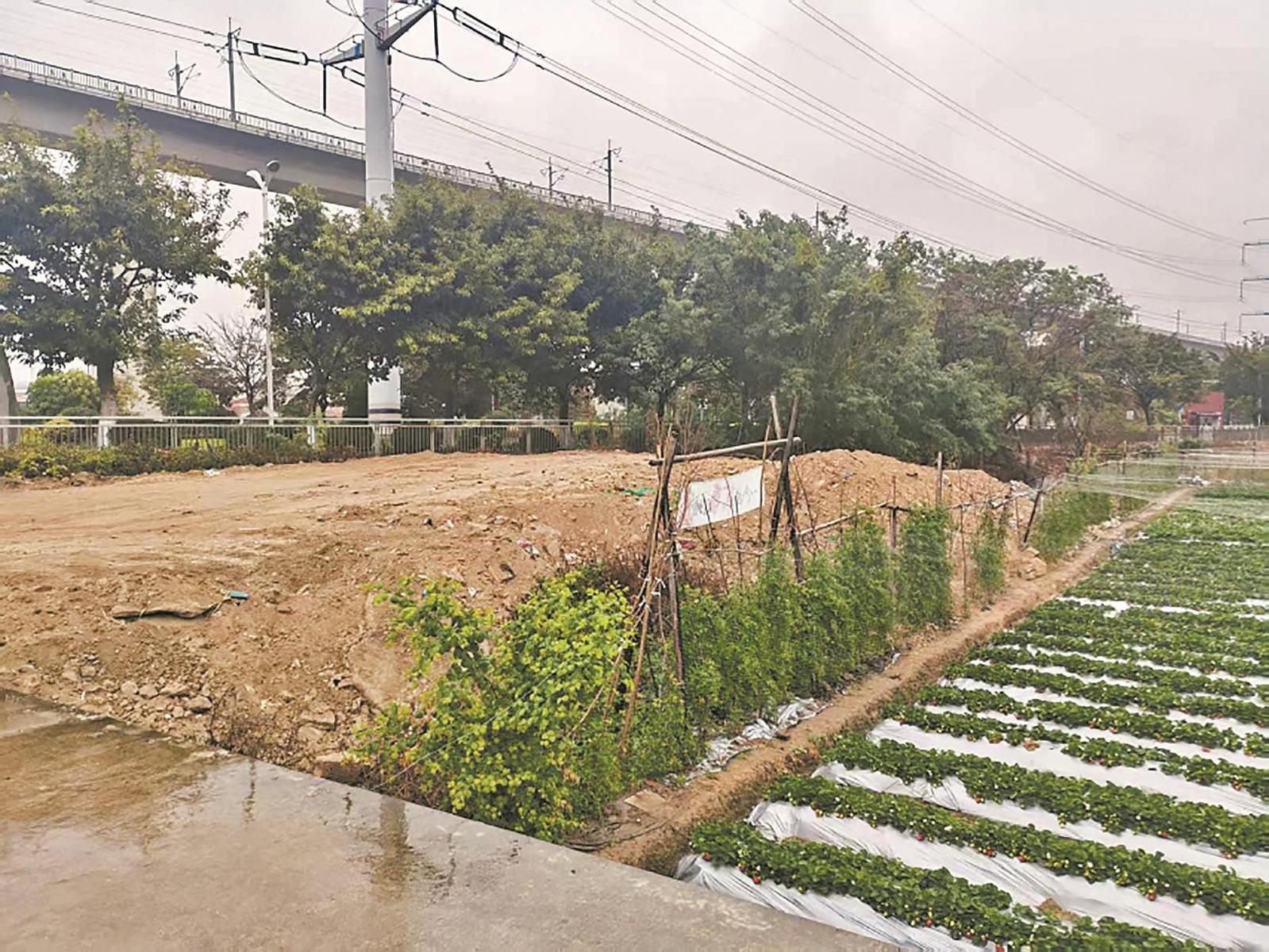25日上午10时许,记者在现场看到,在东西三路和梧林大道交叉路口东侧,一大片土堆十分抢眼,比周围农田高出1至2米。其两侧紧邻公路,另外两侧分别与草莓园、小水塘相接。这块土堆下就是市民所反映的被建筑垃圾掩埋的田地。