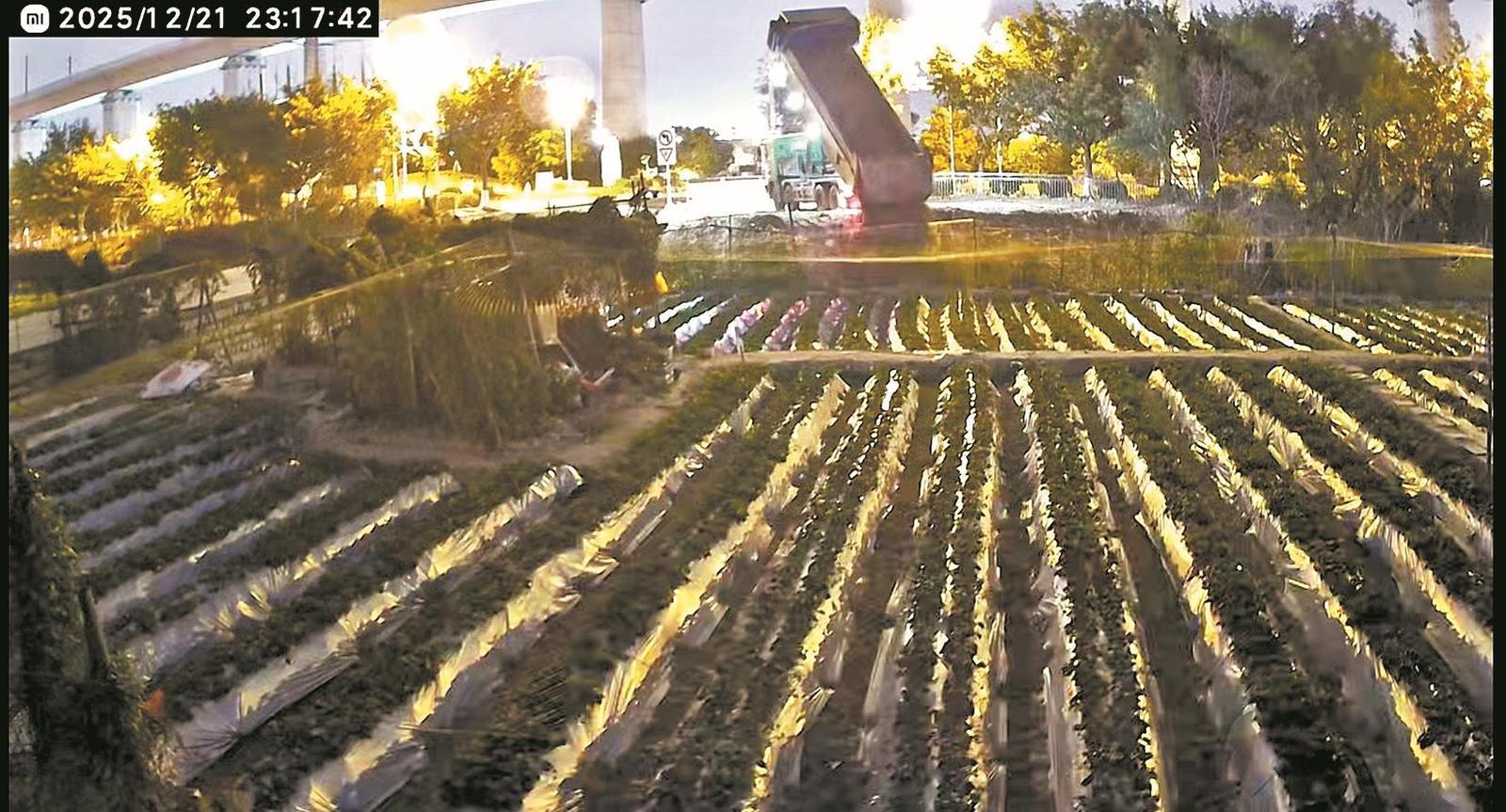 “今年8月我刚种下草莓、小番茄,眼看快收成了,结果一夜之间被埋了好多。”种植户汤先生告诉记者,12月22日,他看到相邻地块堆积了大量渣土和建筑垃圾,部分蔓延至自家农田,灌溉水塘也受到污染。他通过监控发现,12月21日夜间至次日凌晨,有七八辆运输车来回倾倒建筑垃圾,现场还有推土车配合作业。