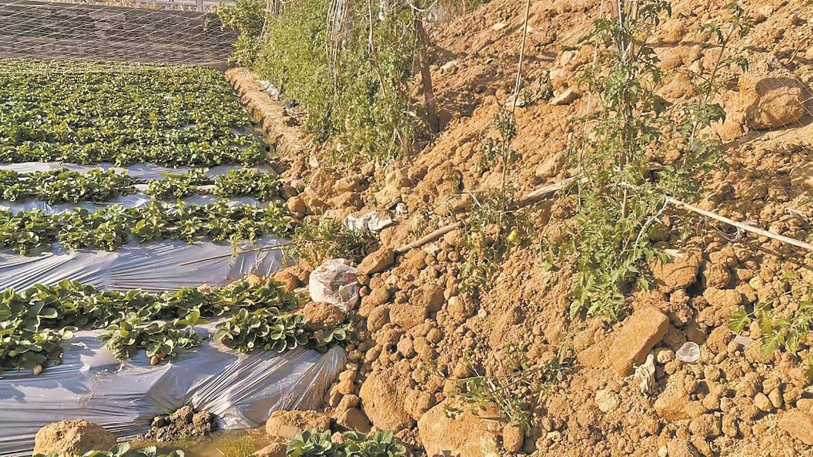 土堆表面并无建筑垃圾,不过记者走了一圈发现,靠近小水塘的土堆下,露出许多砖块、绿色网状物、塑料瓶等杂物,部分垃圾已落入水塘,临近草莓园的土堆则掩埋到一些小番茄藤蔓。