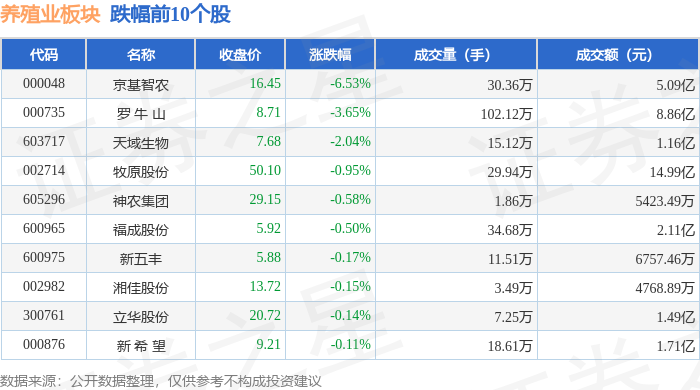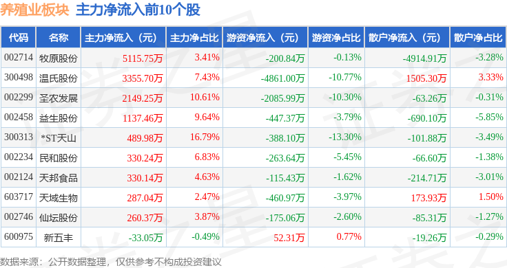 从资金流向上来看,当日养殖业板块主力资金净流出6303.14万元,游资资金净流出5117.35万元,散户资金净流入1.14亿元。养殖业板块个股资金流向见下表: