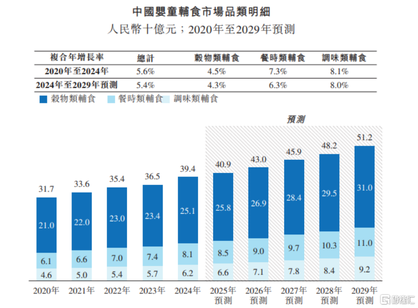 按品类划分,在中国婴童辅食市场中,谷物类辅食仍是核心品类,2024年的市场规模为251亿元;餐食类辅食和调味类辅食正成为快速扩张的细分市场,预计到2029年这两类产品市场规模将分别达到约110亿元、92亿元,2024年至2029年的复合年增长率分别约6.3%及8%。