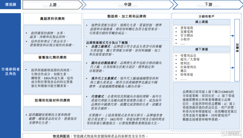婴童零辅食行业价值链上游为农副产品原料、营养强化剂及设备包装材料供应商;中游为加工企业及品牌方;下游为销售渠道,品牌方通过下游渠道触达消费者并销售产品。