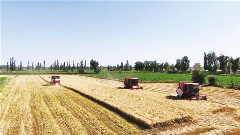 瓜州县南岔镇九南村的麦田里大型联合收割机穿梭作业。(资料图)