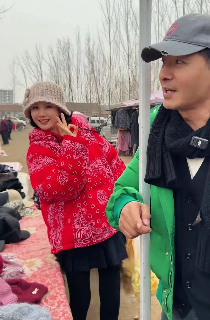 她穿着红色花棉袄,赶农村大集的样子,颇有农村人的模样。