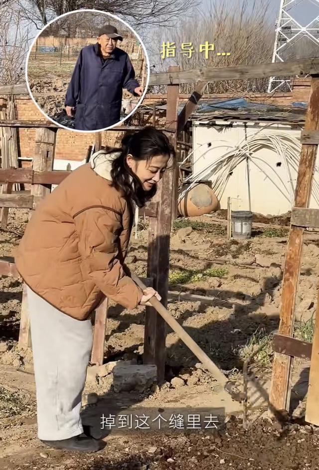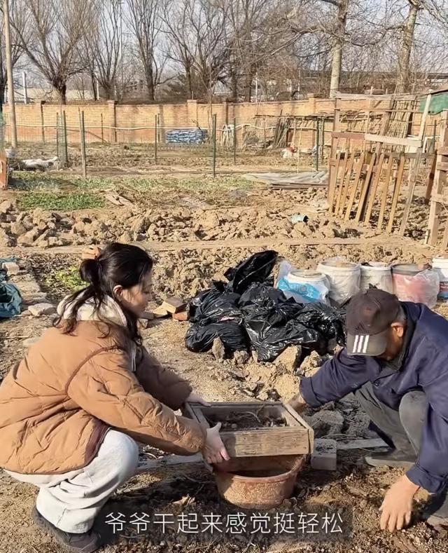 51岁的梅婷,身上丝毫没有城里人的矫情。她陪着爷爷一起种菜,不仅亲自弯腰翻土、还学着爷爷的样子筛土,也不怕弄得满身都是泥土。