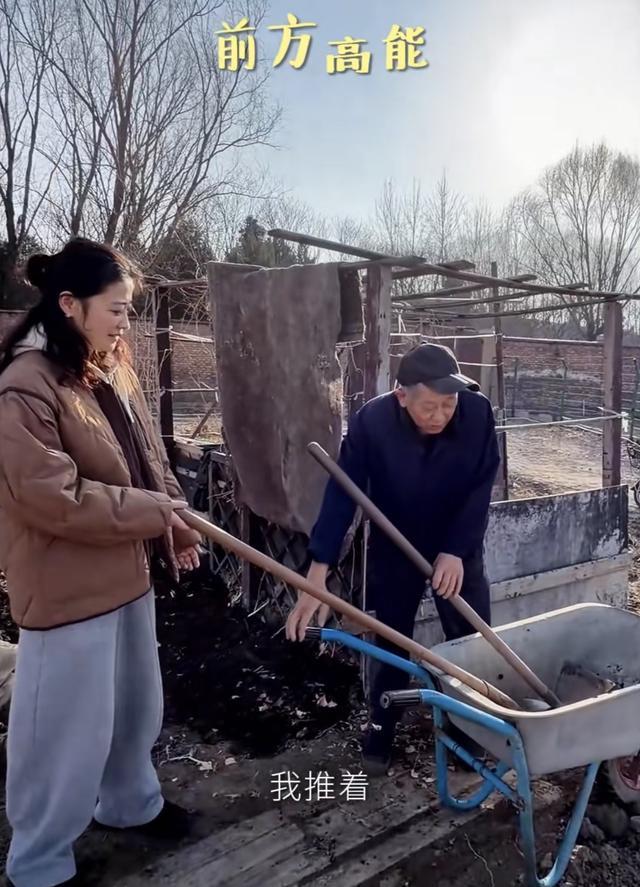爷爷在前面推着小车一路高歌,梅婷跟在后面伴舞,这个画面太美好了。