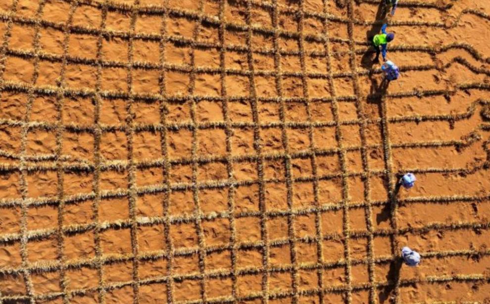 中国治沙的第一步就是用干草扎进沙里,制造“草方格”,其作用便是固定流沙,减缓风速。