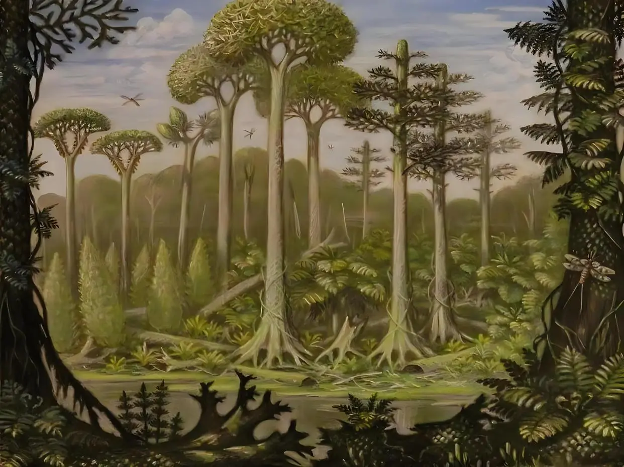 那个年代,陆地上还没有恐龙等大型猛兽,完全是植物的天下。没有天敌的制约,植物们疯狂生长,一棵棵巨树拔地而起,连成一片又一片无边无际的森林,那是地球有史以来森林覆盖率最高的时代,堪称“森林王国”。