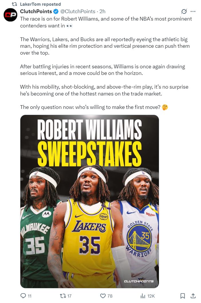 根据美媒Clutchpoints的报道,罗威的争夺已经拉开序幕,联盟中一些顶级球队也已经加入,勇士、湖人、雄鹿都对这位身材高大的内线球员感兴趣,他们希望罗威可以提升自家球队的护框、篮板能力。