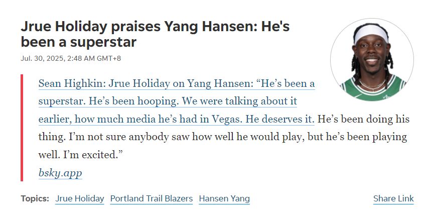 开拓者新援朱-霍勒迪也在采访中谈到杨瀚森夏联的表现:他打得像个超巨,球打得真的挺棒。我们之前聊过他,他在拉斯维加斯受到了巨大的媒体关注,这是他应得的,没有人能预料他可以打得如此出色,我很兴奋可以跟他一同打球。