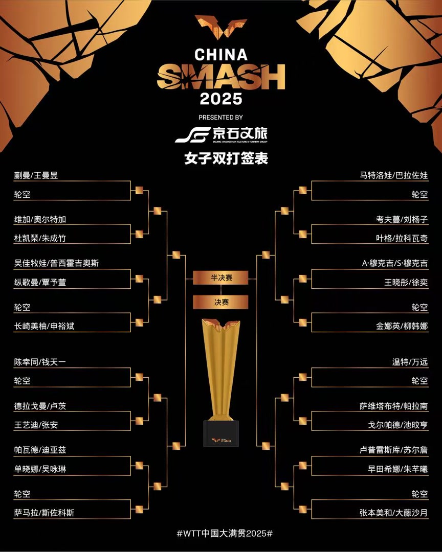9月26日晚,WTT中国大满贯三个双打项目的签表出炉。中国队在三个项目中均有五对选手参赛,其中男、女双打均有四对选手挤在同一半区,会师决赛难度不小。备受关注的混双新组合陈垣宇/蒯曼则签运不佳,或将连遇头号种子和“莎头”组合。