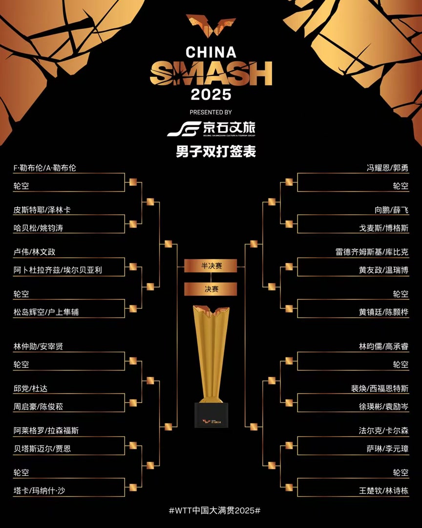 中国男双此次由王楚钦/林诗栋领衔,两人被列为2号种子,所在的4/4区有5号种子林昀儒/高承睿、前世锦赛冠军法尔克/卡尔松、国乒外卡组合徐瑛彬/袁励岑等强手。向鹏/薛飞和世青赛冠军黄友政/温瑞博处在3/4区。上半区则只有周启豪/陈俊菘一对国乒组合,将“单挑”头号种子勒布朗兄弟、3号种子安宰贤/林钟勋等劲敌,想要突围实属不易。