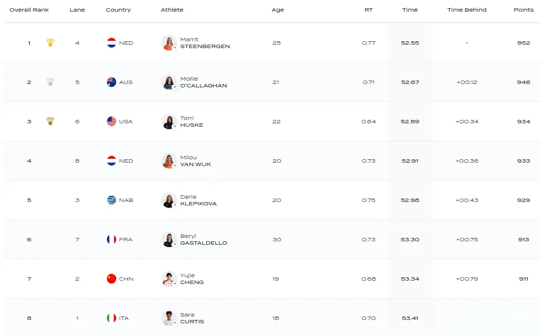 半决赛排名第1晋级的荷兰名将斯汀伯根延续出色晋级状态,力压奥卡拉汉0.12分夺得金牌,如此结果还是有些许意外,美国的赫斯卡则是季军。中国选手程玉洁,53秒34的成绩位居第七名,距离领奖台还是存在一定差距。