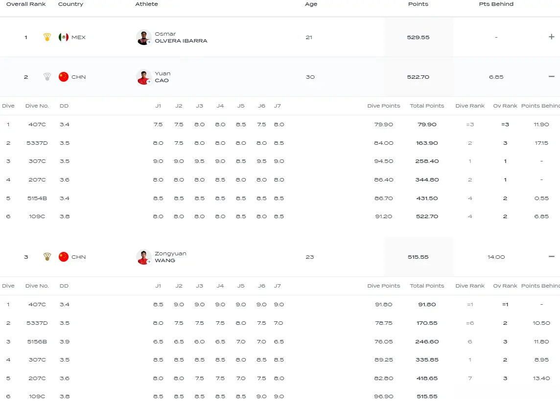 中国两位选手闯进决赛,可惜未能拿出最佳状态,遗憾错失金牌。30岁的曹缘摘得银牌,整体表现较为平均,大部分动作可能没有特别的亮眼;王宗源则是获得铜牌,其中三个动作都有出现小瑕疵,导致分数不高,尤其相比于半决赛的起伏偏大。墨西哥的名将奥斯马尔一鸣惊人,尽管有出现小失误,但最后两跳近乎完美的发挥是锁定金牌。