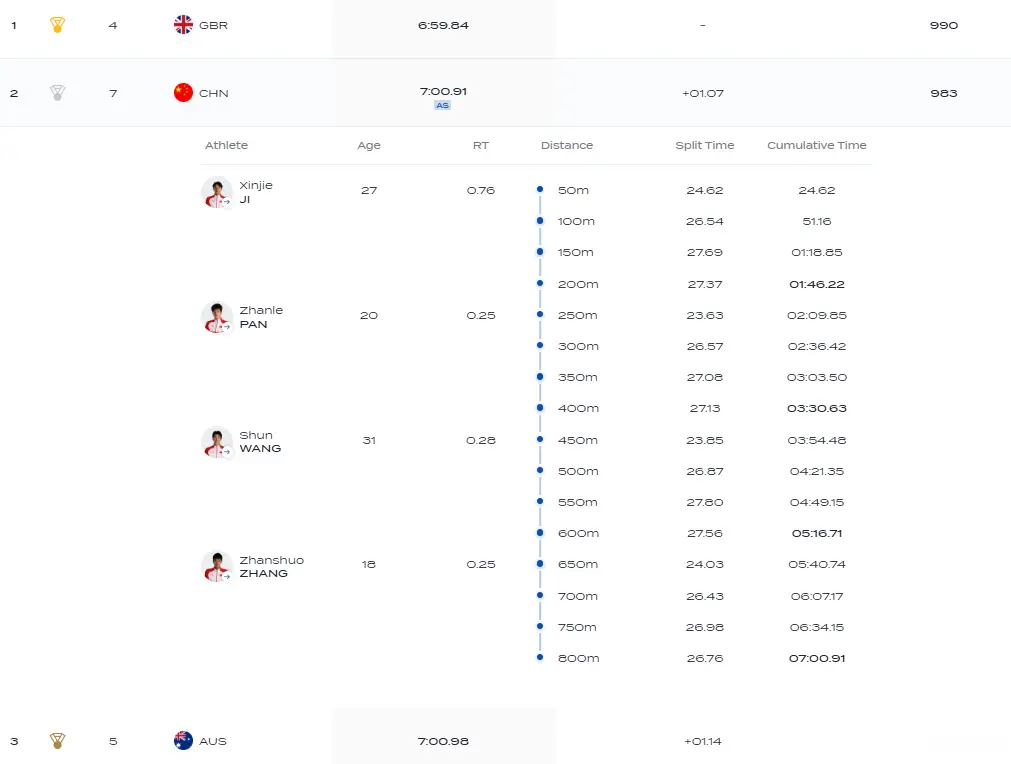 英国队加冕冠军。中国队银牌,四棒分别是季新杰、潘展乐、汪顺和张展硕,全员都游出极佳表现,即使会有起伏,但总能紧跟前列没有掉队,最后一棒50米的冲刺,小将张展硕连续超越美国和澳大利亚两支球队,获得亚军,同时创造新的亚洲纪录,这拼劲值得称赞。