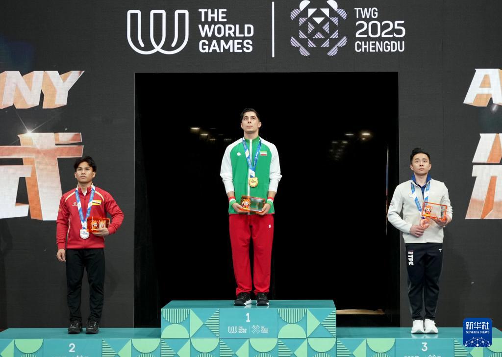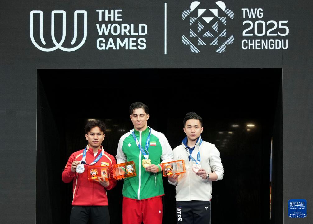 8月8日,冠军伊朗选手巴尼塔莱比(中)、亚军文莱选手鲁斯兰(左)、季军中国台北选手刘菖闵在颁奖仪式上。