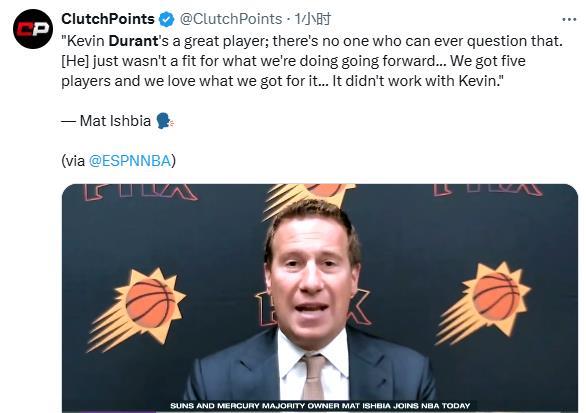 伊什比亚还表示:凯文-杜兰特是一位伟大的球员,这一点毋庸置疑,他的职业生涯非常精彩,他只是不太适合我们未来的发展方向;我们换来五名球员,我们对这笔操作很满意,很享受这样的组合,但杜兰特的加盟并没有奏效。