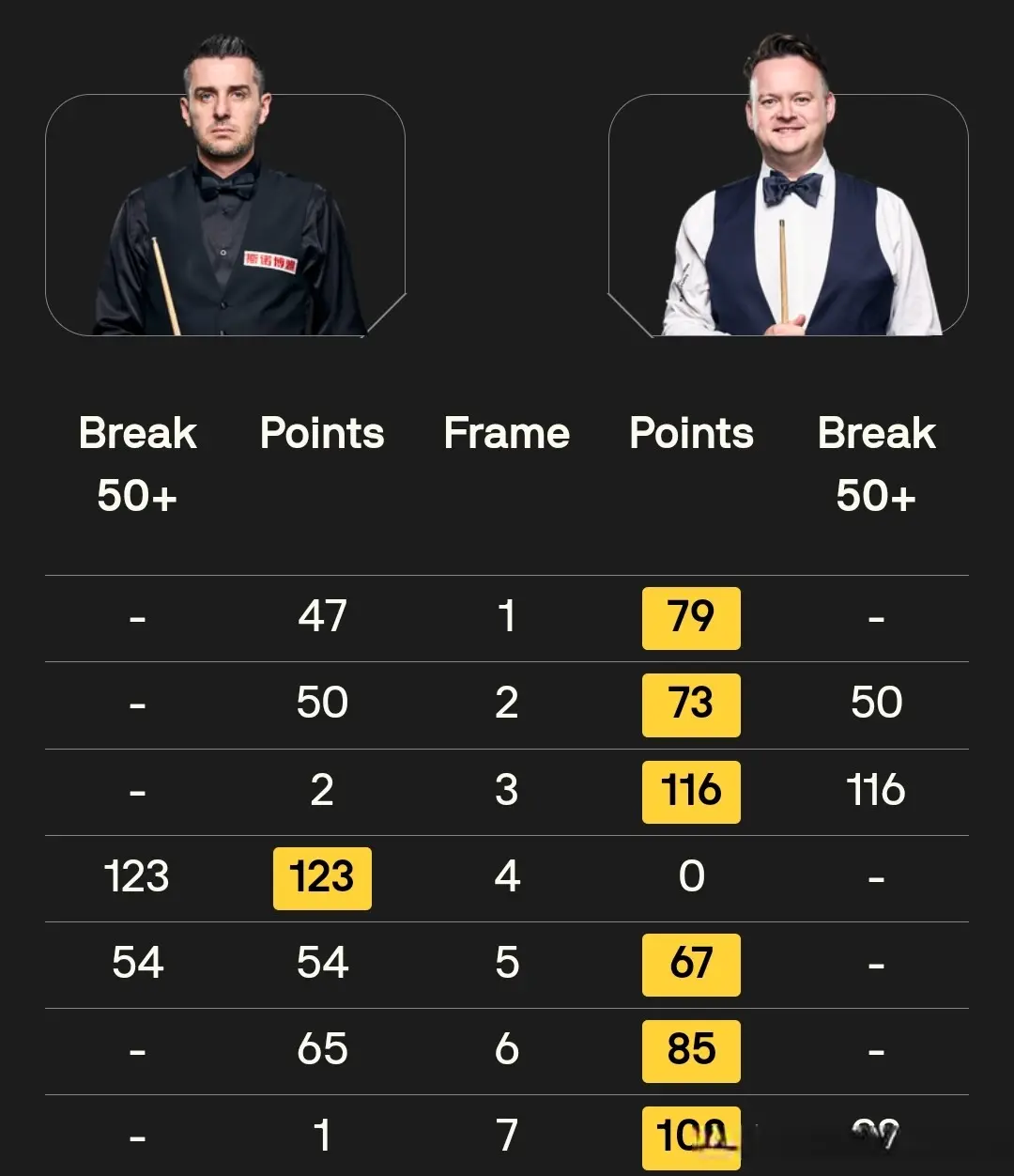 在上半场比赛中,墨菲的状态明显比塞尔比出色。首局比赛中,墨菲抓住多次上手的机会拿到79分并以79:47拿下此局比赛的胜利成功取得1-0的领先。
