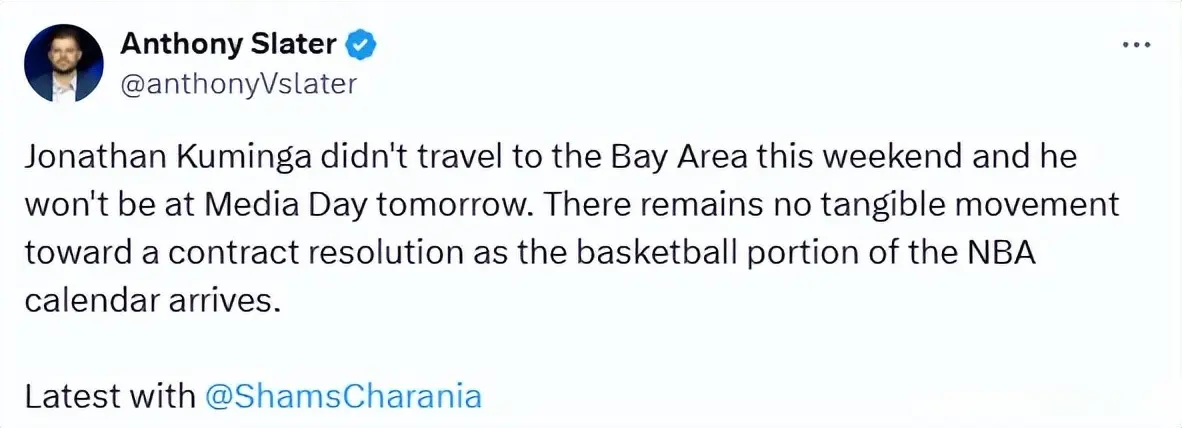 勇士队记Anthony Slater和名记shams进一步联合报道,库明加本周不会前往旧金山,也不会出席周二的媒体日,邓利维与库明加的经纪人亚伦-特纳进行了联系,但在球队周三首次训练之前,在库明加的合同或归队方面没有取得任何进展。
