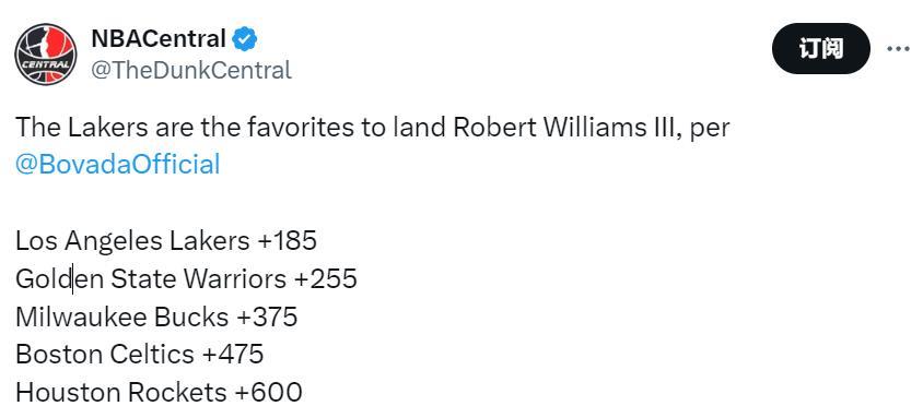 北京时间7月26日,深陷交易流言的开拓者中锋罗伯特-威廉姆斯下家赔率出炉,湖人居首勇士第二。对于杨瀚森来说,如果开拓者真的交易走罗威,无疑是一大利好。他有望获得更多出场时间。此前开拓者队记Dave Deckard表示,杨瀚森和克林根并非竞争对手,两人的竞争对手都是罗威。