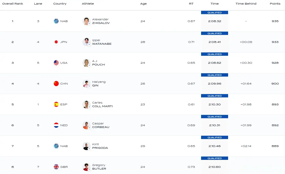 禹景铭第二组第5道,前50米发挥还行,但后程掉速非常明显,仅游出2分02秒29的成绩,小组排名第5,总排名第34位。虽说是17岁的小将,但如此表现太糟糕,相比于正常水准差很远,不知道是状态原因,还是训练没做好。现在看起来中国游泳男队的仰泳还是只能靠着老将徐嘉余,年轻队员完全不能站出来。