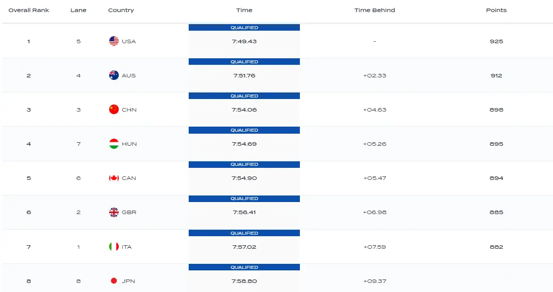 中国队3道登场,第一棒是12岁小将于子迪,速率中规中矩,暂时排第6位置;第二棒余依婷,逐渐提速让排名升第3;第三棒吴卿风,连续比两枪对她有些许影响,略有掉速;第四棒杨佩琪,发挥不错,最终以7分54秒06的成绩位居第三晋级决赛。