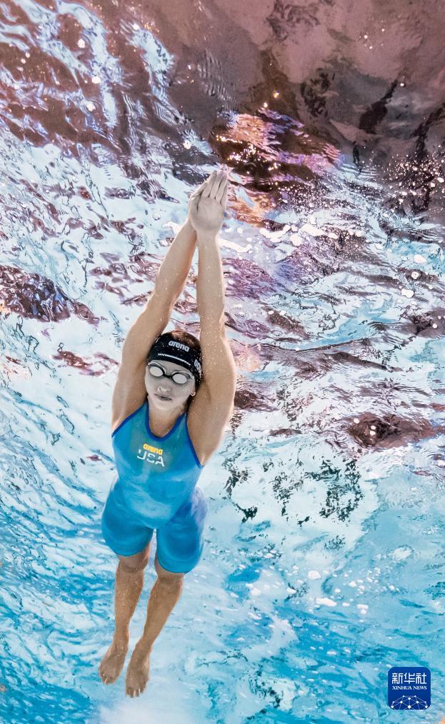 8月2日,美国队第一棒选手亚历克西(中)在比赛中。最终,美国队获得冠军,并创造新的世界纪录。