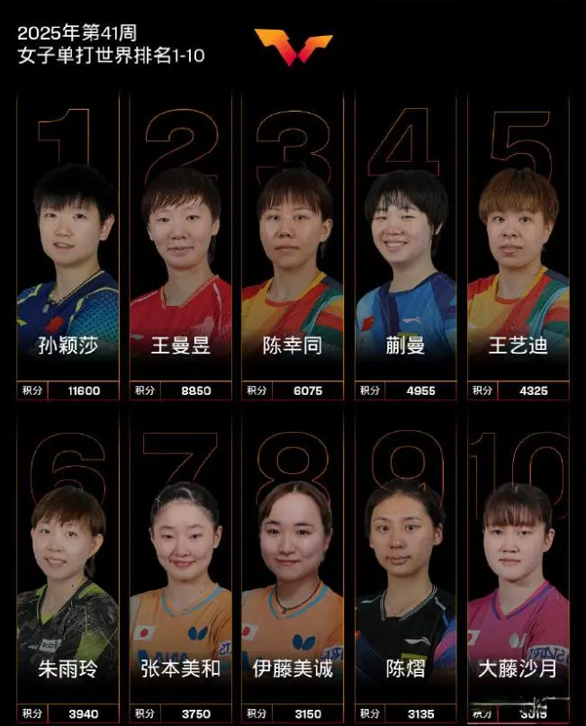北京时间10月7日,WTT官方发布了最新一期的世界排名榜单,朱雨玲女单积分3940排在外协第一,她再度反超张本美和(3750分),朱雨玲身前是孙颖莎、王曼昱、陈幸同、蒯曼、王艺迪五位国乒选手。