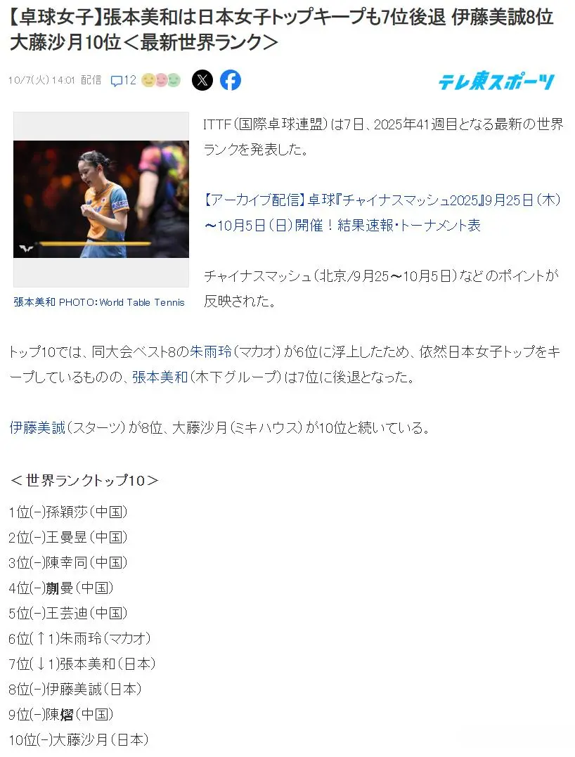 在10月7日日本媒体《东京体育网》转发WTT官方世界排名文章,写道:张本美和世界排名下降一位掉至第七,伊藤美诚第八,大藤沙月第十。