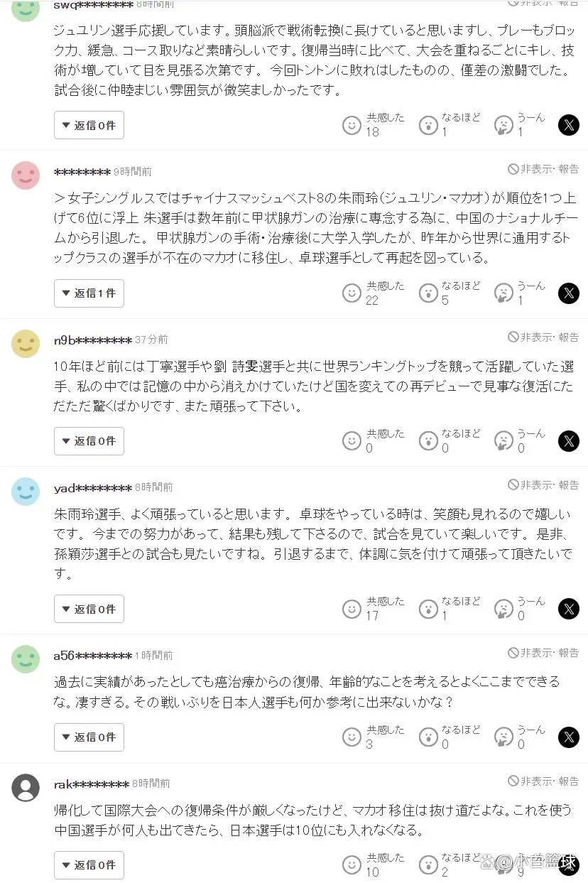 评论区很多日本球迷在祝贺朱雨玲,也有对日乒前景不看好的声音: