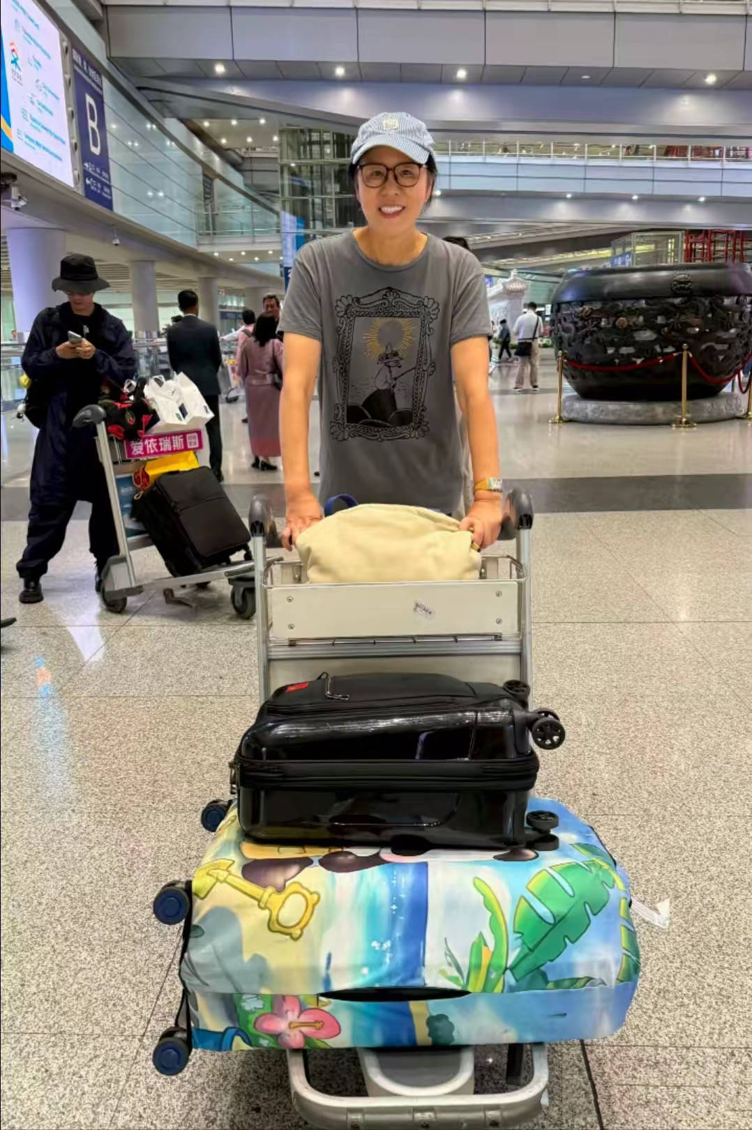 落地后,她一个人推着行李,脸上都是自信,是那种回归故土的骄傲。郎平的行李箱也蛮可爱的,卡通的款式非常有趣,不知道是不是她女儿白浪的的行李箱。