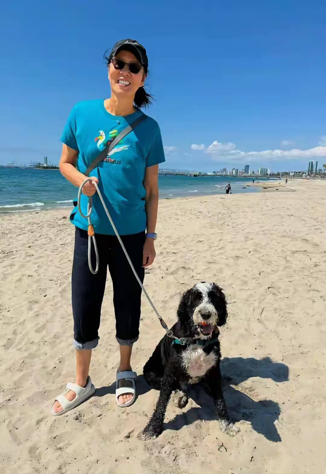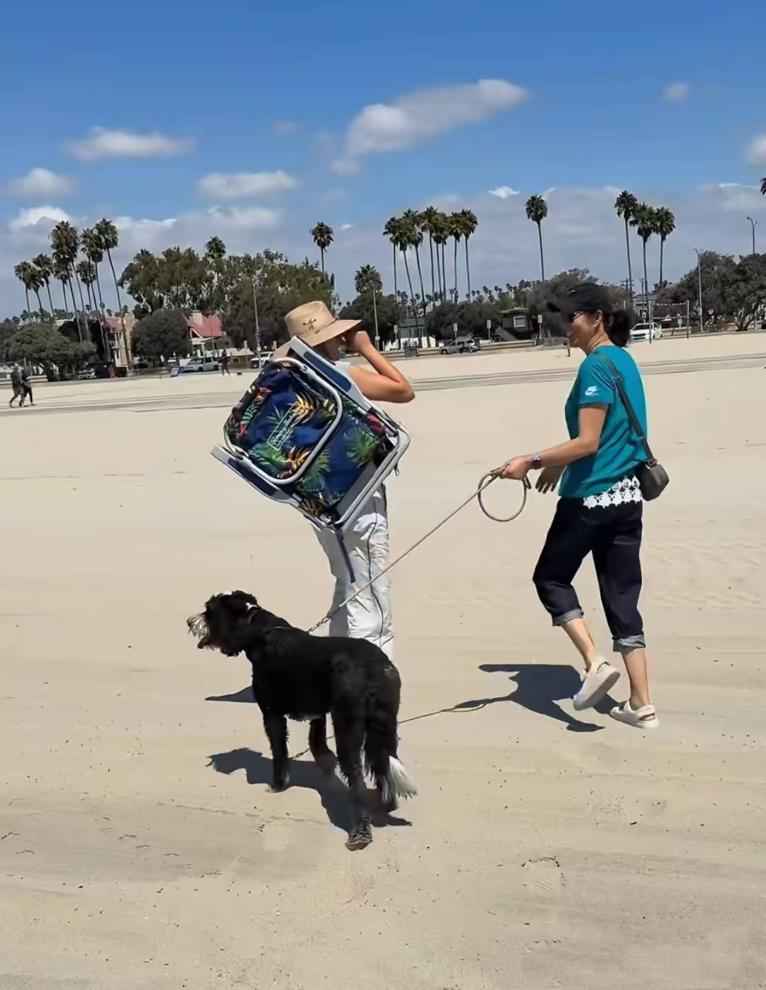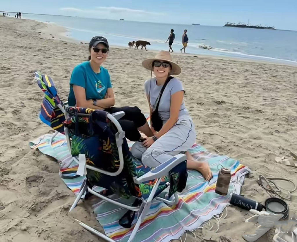 休息日的时候,和女儿一起到海边遛狗,小日子过得轻松惬意。母女俩对着镜头微笑,就像一对姐妹一样。
