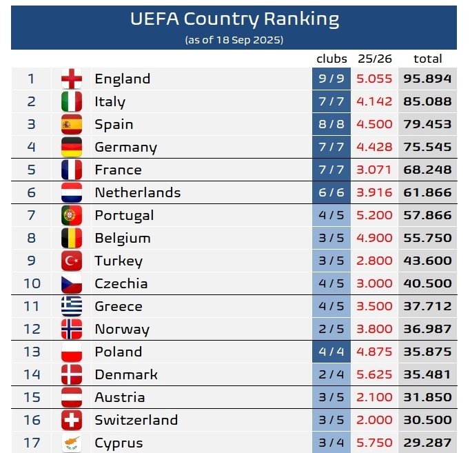 直播吧9月19日讯 欧冠联赛阶段首轮已经完赛,相关机构也统计了本赛季的欧战积分情况,并更新了欧足联旗下各协会的积分排名。英格兰依然独自领跑,而意大利第二的位置仍暂时牢固,但领先优势有略微缩小。
