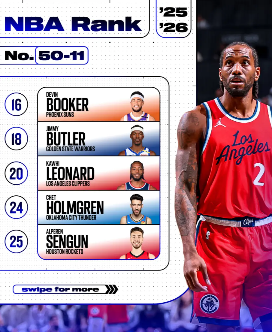 北京时间9月25日,ESPN评选的2025年百大球星已经更新到50-11了,雷霆队的杰伦-威廉姆斯排在第11,伦纳德20,巴特勒18,布克16分,霍姆格伦24,申京25。
