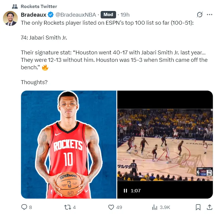 休斯顿火箭队在100-51排名内只有一人入选,那就是小贾巴里-史密斯,他排在2025年第74位,火箭记者认为小贾进入百大球星的理由,去年火箭有小贾的比赛40胜17负,他缺席的比赛12胜13负,当小贾替补时火箭15胜3负。