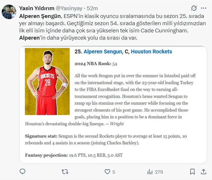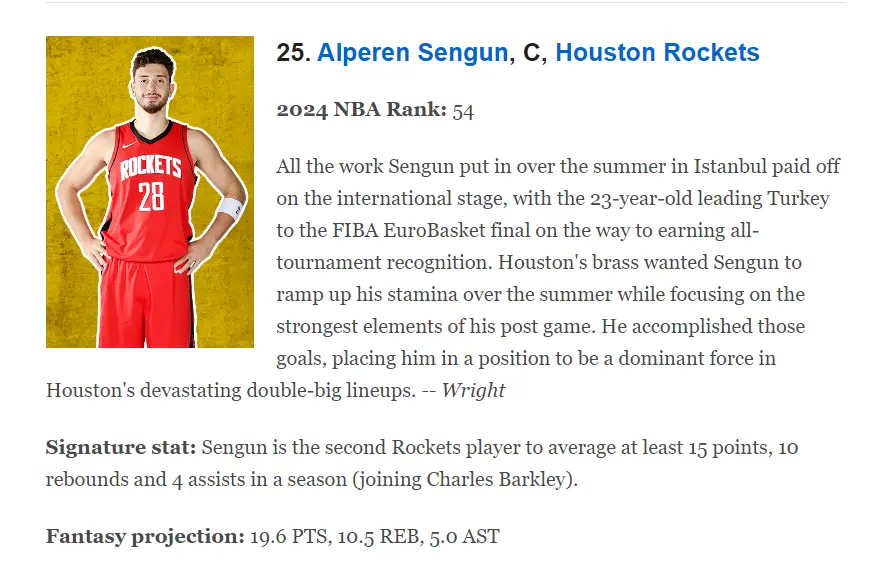 ESPN对申京的评语:这位23岁的球星今夏帮助土耳其男篮打入FIBA欧洲杯决赛并且他入选最佳阵容获得认可,整个夏天申京都很有统治力,同时他上赛季是火箭西部第二的关键,他是火箭队的主导力量。