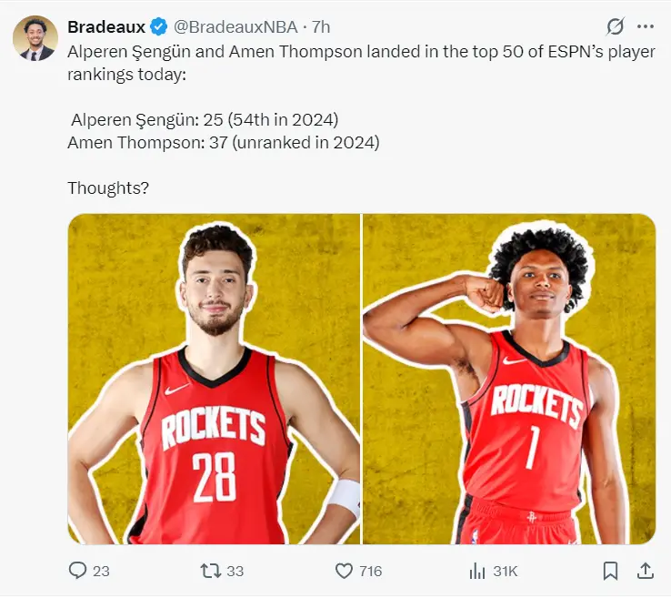 土耳其球迷:申京在ESPN的排名中排名25位,他是我国球员唯一进入前50的球员,他去年仅排54,申京还很年轻有很长的路要走,他的排名还能继续提升。【能感觉出球迷略有不满,认为申京不该比霍姆格伦、阿德巴约、班凯罗还低】