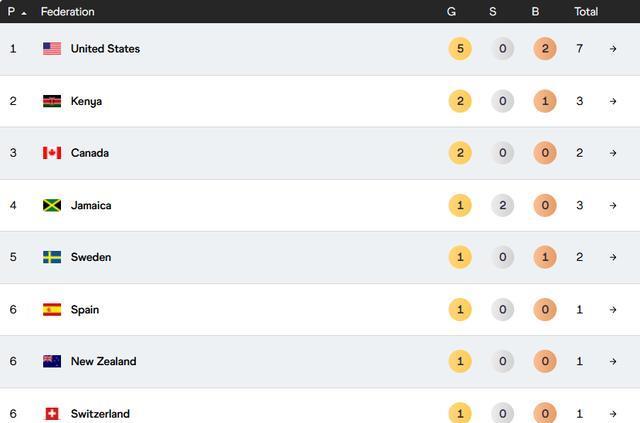 前3日过后金牌榜上,中国队已经到了第15位,日本队排名第21位;美国队5金2铜依旧领先、优势明显。#田径世锦赛#