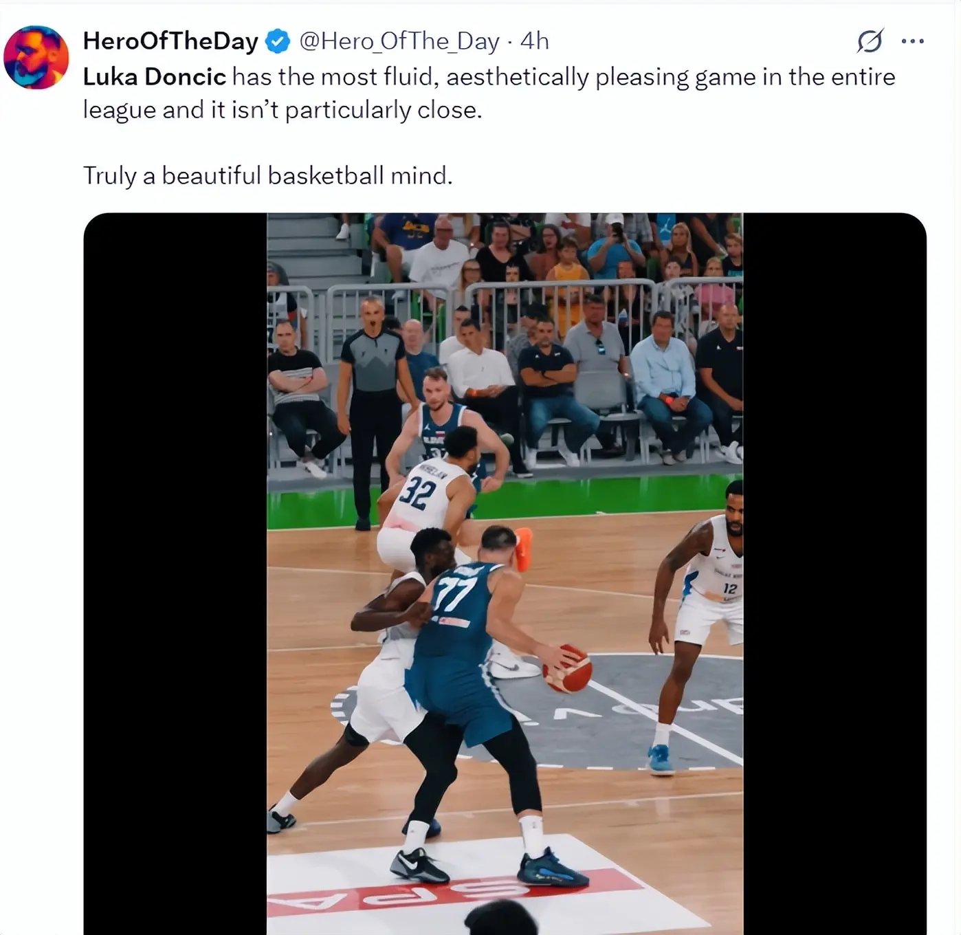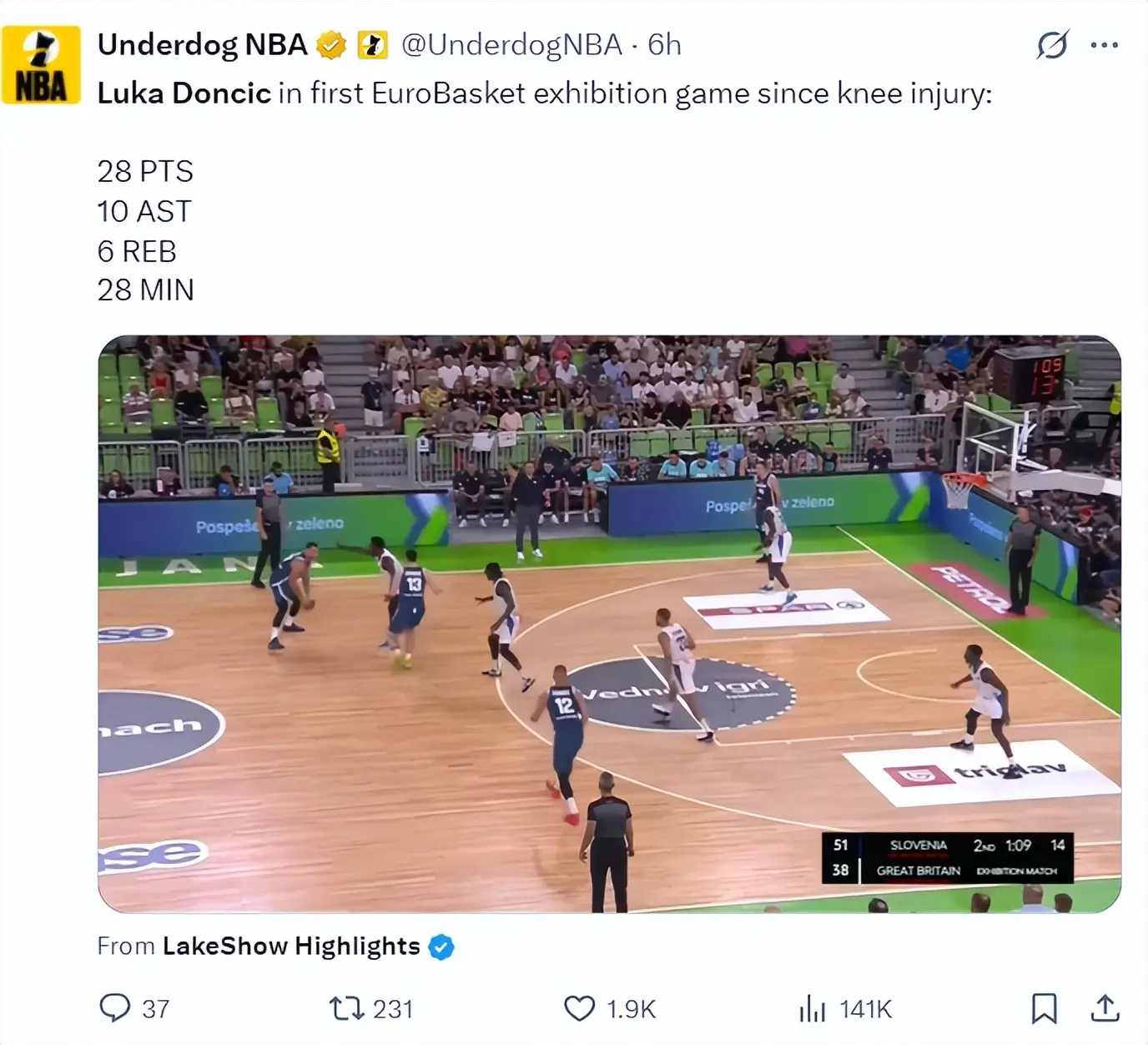 北京时间8月20日,欧锦赛男篮热身赛,斯洛文尼亚男篮93-81轻取英国男篮。此前在热身赛中被队友误伤压到膝盖的卢卡-东契奇此役复出,他上半场就狂砍21分5助攻3篮板,全场比赛28分钟提前打卡拿到28分10助攻6篮板3抢断。