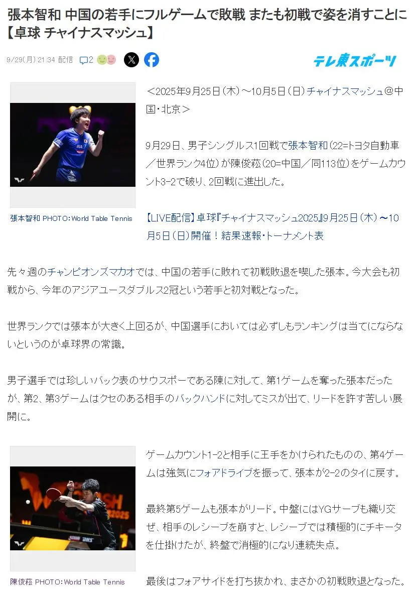 赛后日本媒体《东京体育网》第一时间发文:张本智和选手与中国年轻选手鏖战五局败北,张本智和作为世界排名第四首轮游止步64强。