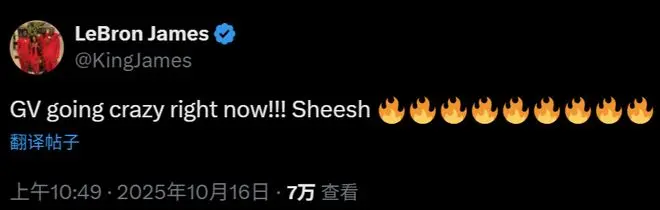 文森特此役出战25分26秒,疯狂命中6记三分得到22分3助攻,尤其是首节不到7分钟狂轰5记三分得到18分,也是让詹姆斯通过社媒夸赞“文森特要疯了”。