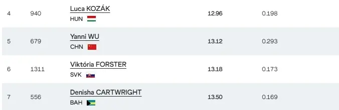 在起跑环节,吴艳妮有点受到旁边选手的影响,反应时间只有0.293秒,在本组所有选手中排名最后。对此吴艳妮也在赛后接受央视采访时表示:“世锦赛我就是按照自己一些预期吧,就是破13大关。理想的话就是跑12秒8,12秒80左右。”