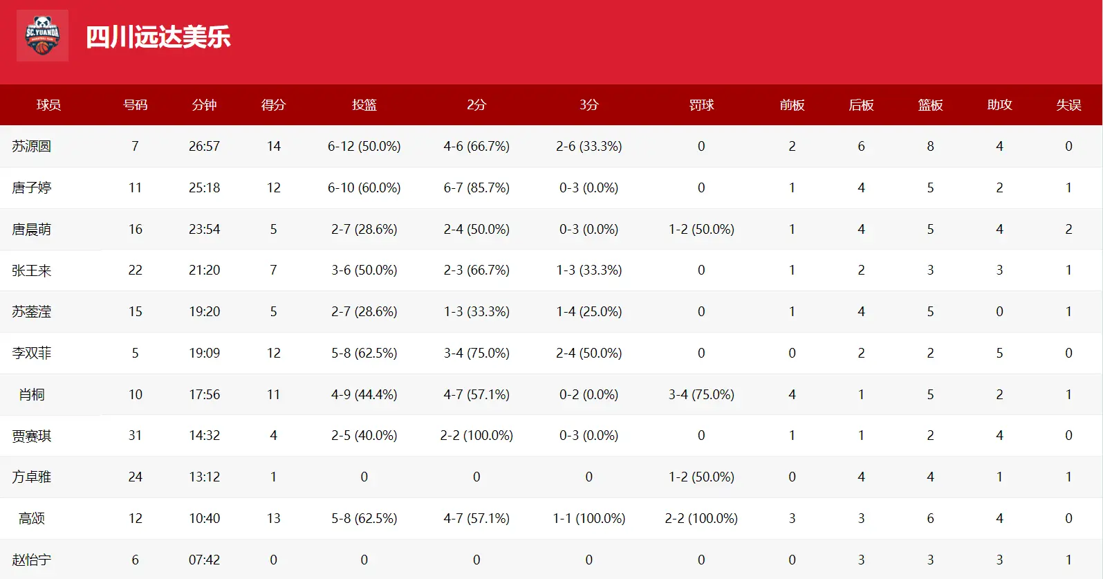 可以看到这场比赛四川队是12人轮换,胡怡宁都得到了7分42秒的登场时间,全队5人上双,苏源圆14分8篮板4助攻,唐子婷12分5篮板,李双菲12分5助攻,肖桐11分5篮板,高颂13分6篮板4助攻,换言之王思雨、李梦、田媛媛都登场(韩旭还在云南跟随中国女篮集训)