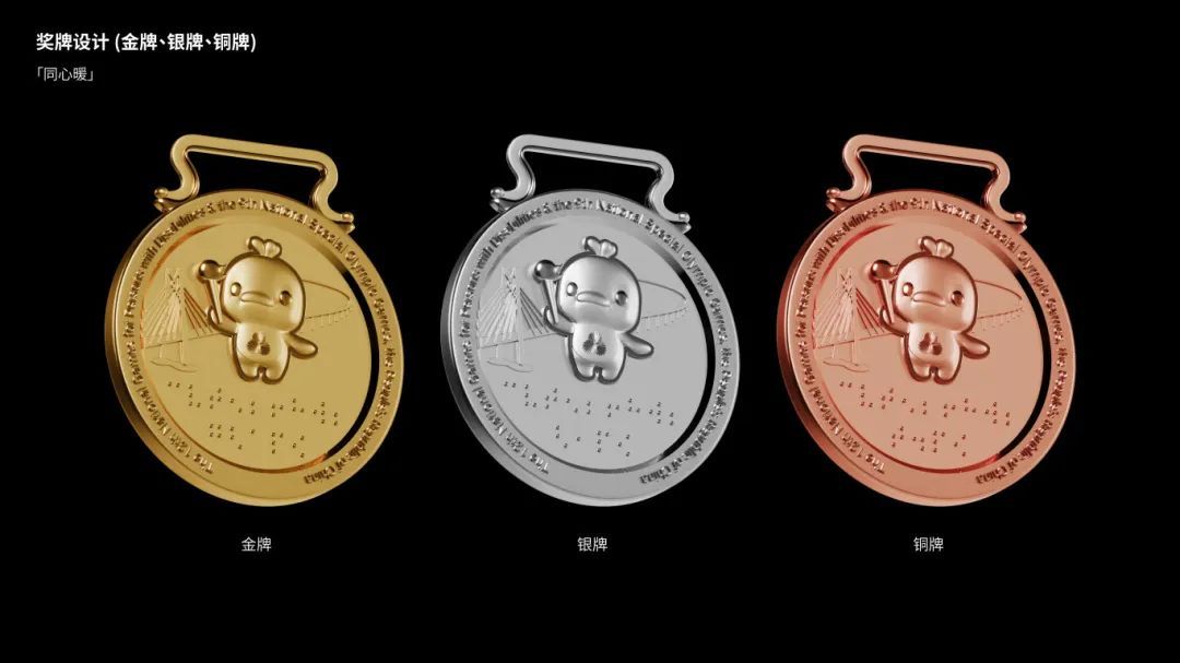 奖牌取名“同心暖”,“同心”展示社会文明和残疾人事业的发展,象征全社会同心同德、携手并肩,共同关心支持残特奥会,体现运动员、教练员、志愿者及社会各界同心协力、勇创佳绩的精神,也契合残健融合、共建共享的理念。“暖”传递社会对残疾人的人文关怀,彰显友爱、互助、温暖的氛围,也寓意着奖牌承载的荣誉带给运动员内心的温暖与激励。
