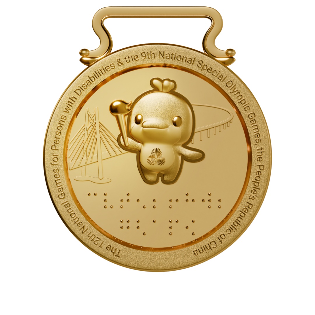 奖牌背面,中华白海豚浮雕,吉祥物高擎火炬,象征奥林匹克精神生生不息、代代相传。浮雕下方创新性地应用了盲文(第一行“残特奥会”,第二行分别为“金牌”“银牌”“铜牌”)。体现了对参赛者的用心与尊重,让视障运动员能够亲手触摸这份沉甸甸的荣耀,真切感受属于他们的荣光。背景上的港珠澳大桥是圆梦桥、同心桥、自信桥、复兴桥,体现了逢山开路、遇水架桥的奋斗精神,体现了我国综合国力与自主创新能力,体现了勇创世界一流的民族志气,传递着同心携手、融合发展的图景。